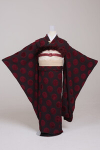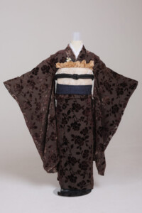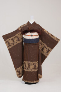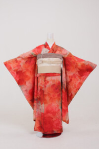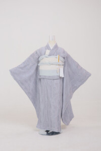 ツイード素材が珍しいお着物。小物のアクセントカラーでおしゃれに。
